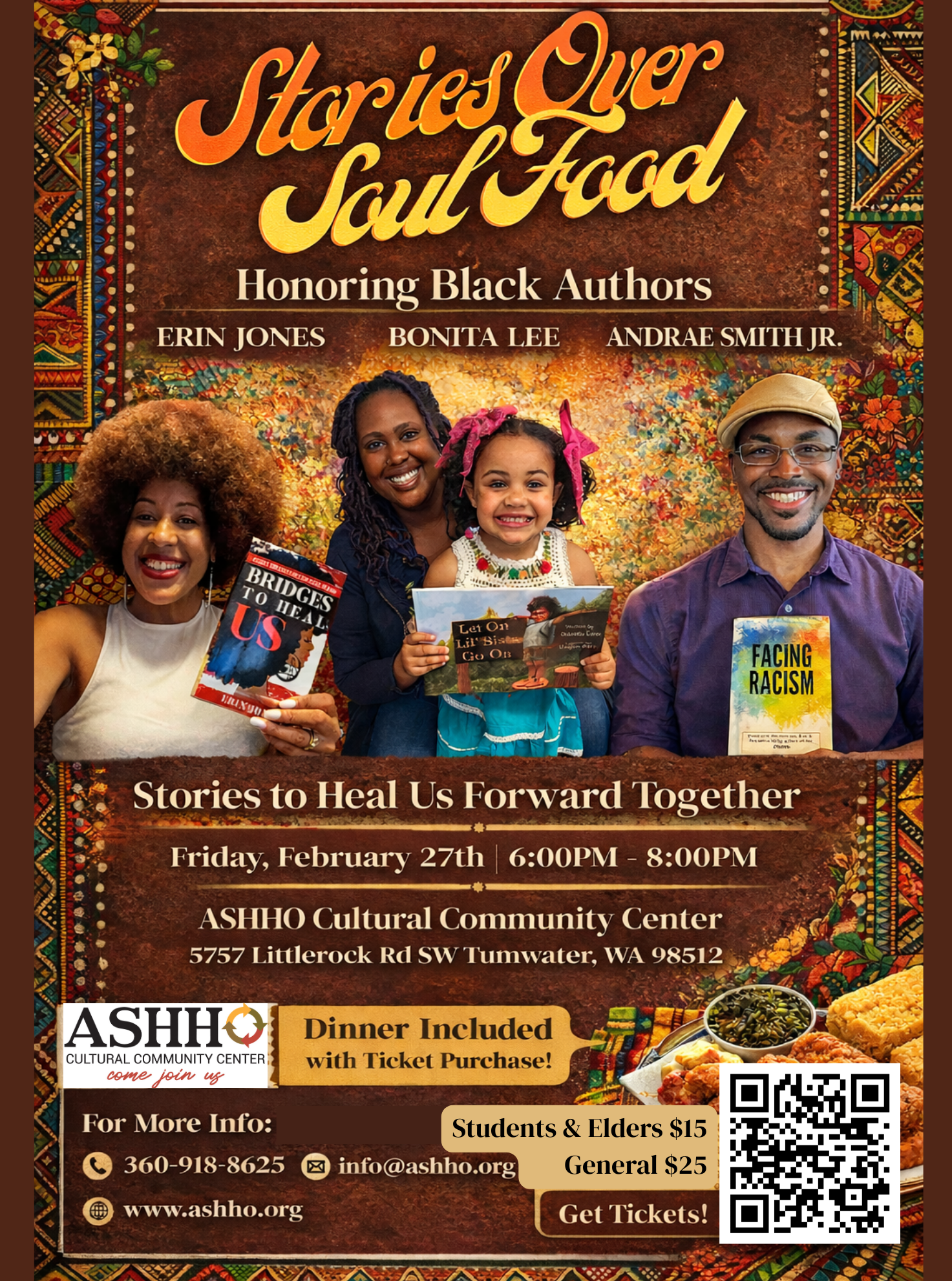 Mark your calendar for Friday, February 27 from 6PM–8PM as we gather for Stories Over Soul Food—an evening of healing, storytelling, and community. In honor of Black History Month, we’re uplifting the voices of three incredible local Black authors: Erin Jones (Bridges to Heal Us), Bonita Lee (Go On Lil’ Sista Go On), and Andrea Smith Jr. (Facing Racism).